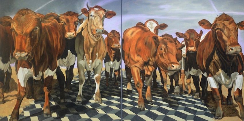 Exposition vue, three cows, oil on canvas, glued on wooden panels, 2021