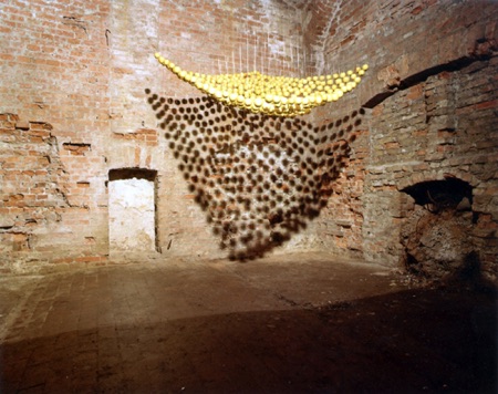 250 kilos of apples hung from the ceiling in the former ice house of the castle of Fürstlich Drehna.